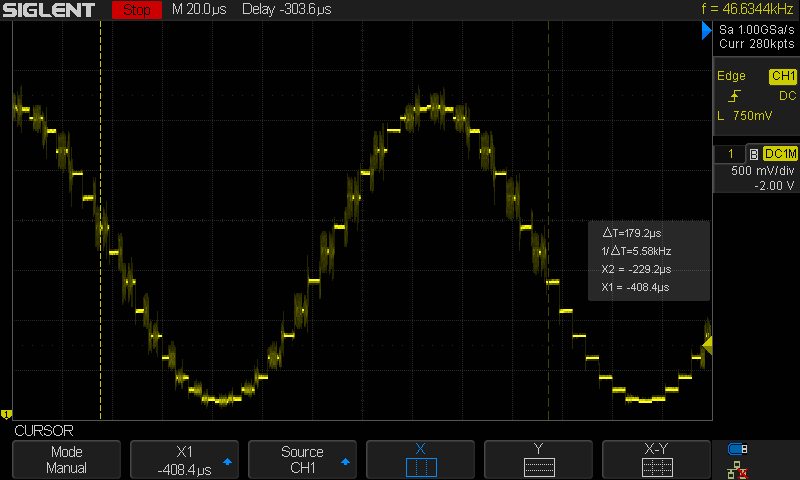 | Dans ce chapitre nous prendrons un shift de 2, donc 128 points par période. Le delayMicrosecond est trop long pour faire un réglage fin. Nous remarquons que delayMicrosecond(255), qui nous donnait une fréquence de 14.95 Hz prend exactement le même temps que : |
